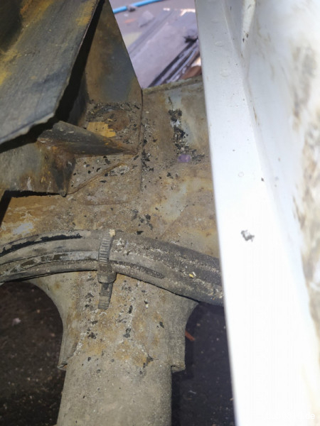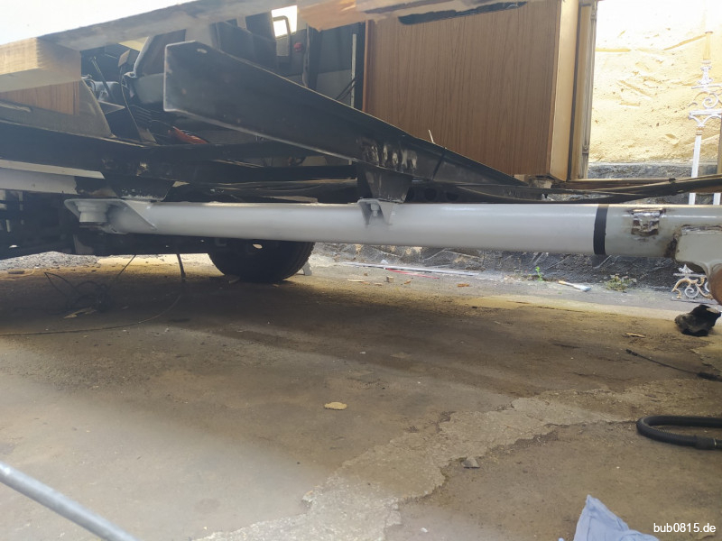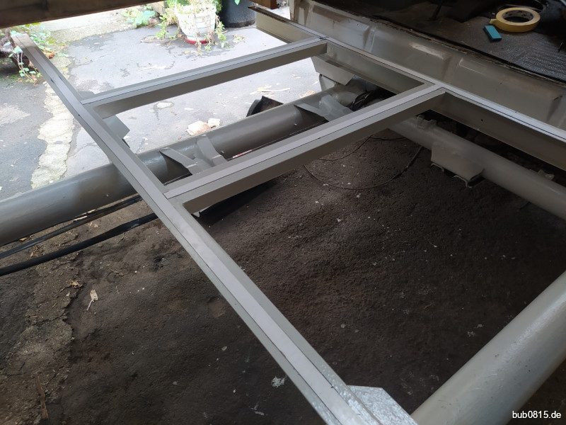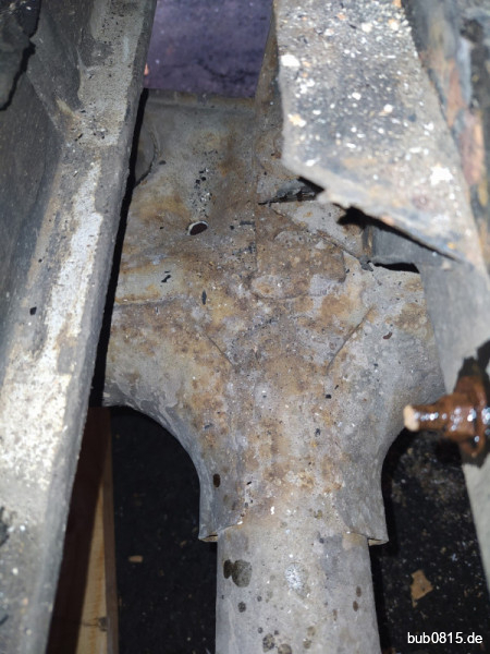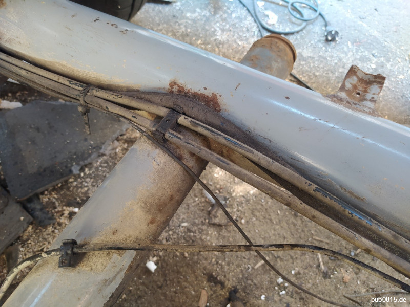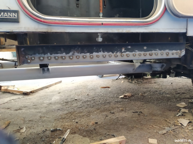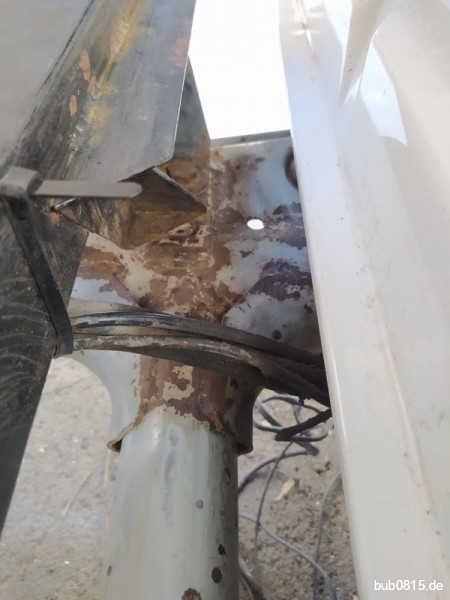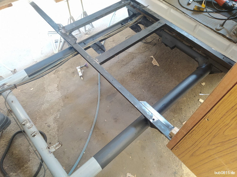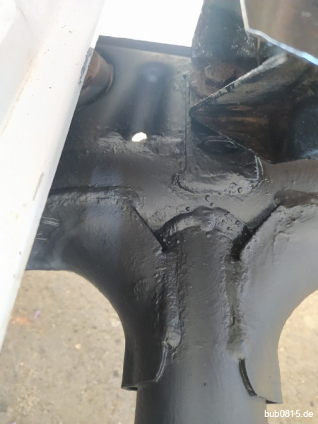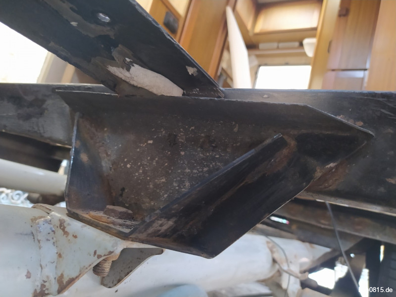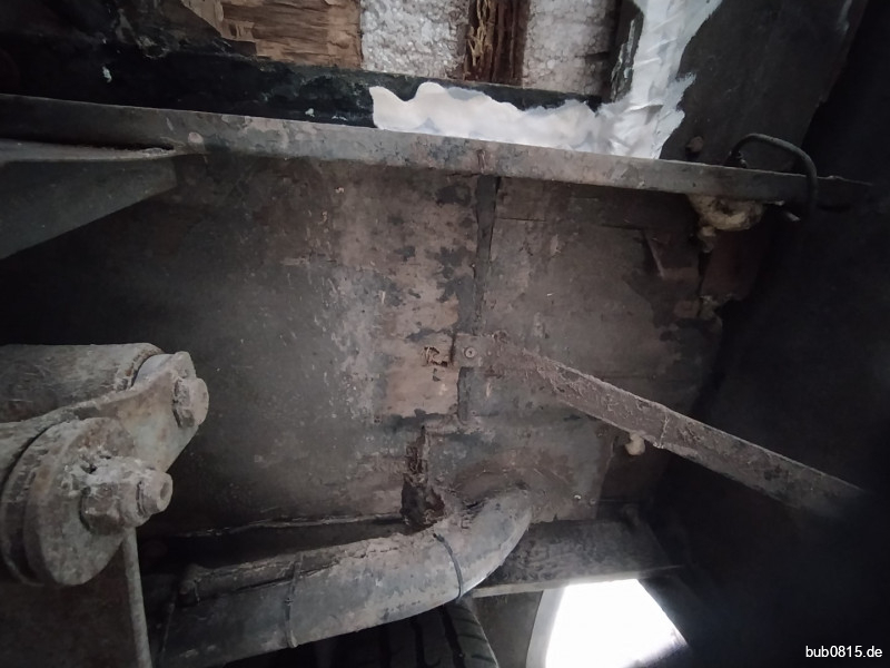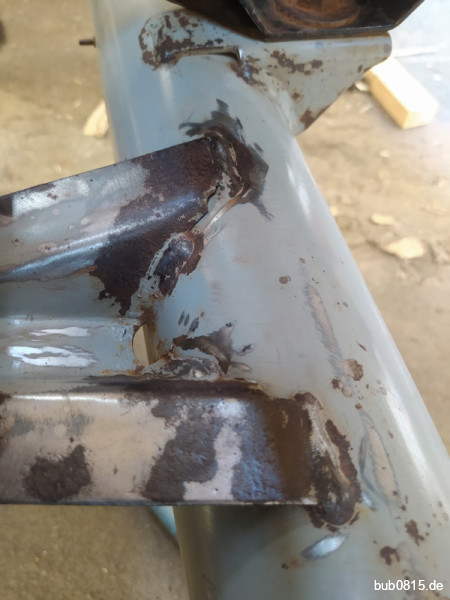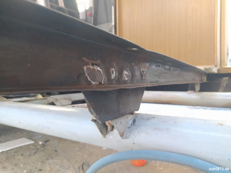 Kritischer sah dagegen der Hilfsrahmen (quer zur Fahrtrichtung) aus, der die Verbindung zwischen Hauptrahmen und Bodenplatte herstellt. Dieser ist aus dünnem Blech (1,5mm) in Form von Kantprofilen gefertigt. Die Verbingung ist durch geschweißte Konsolen erstellt, deren Blechdopplungen zum (durch) rosten neigen. Hier gilt es genau hin zu schauen und im Zweifel stark geschwächte Passagen zu ersetzen. Dafür bietet sich Blech in 3mm an, dass beidseitig verschweißt wird. So verschwindet zumindest an den kritischsten Stellen die Dopplung.
