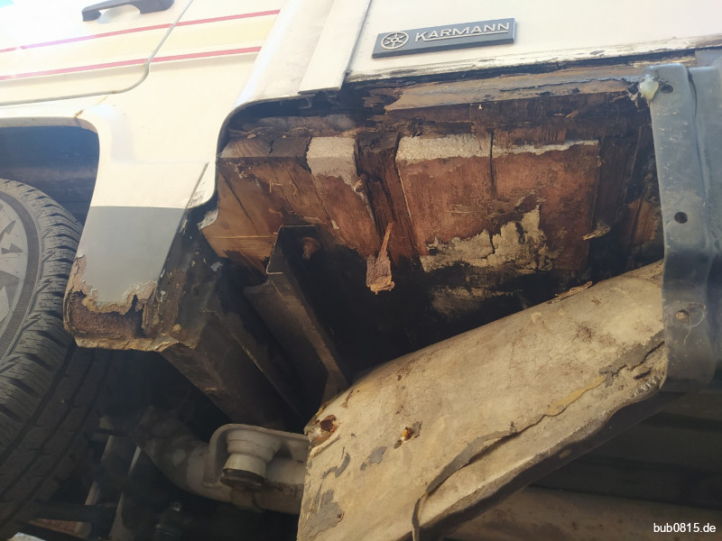 Nach Begutachtung stand fest, dass eine partielle Reparatur das Problem nicht langfristig lösen würde. Auch zeigten der Haupt- und der Hilfrahmen starke Korrossion, die es zu bekämpfen galt. Es stelle sich also die Frage, ob man die komplette Bodenplatte ersetzen könnte. Dies sinnvollerweise ohne den kompletten Wohnaufbau zurück bauen zu müssen. Bei Karmann wurde damals die Bodenplatte mit dem Hilfsrahmen verschraubt und dann der Wohnaufbau Stück für Stück aufgesetzt, verschraubt und verklebt. Die Möbel wurden jeweils sowohl mit der Bodenplatte als auch mit den Wänden verschraubt.