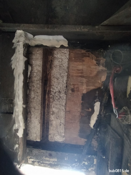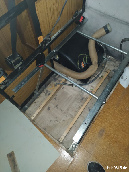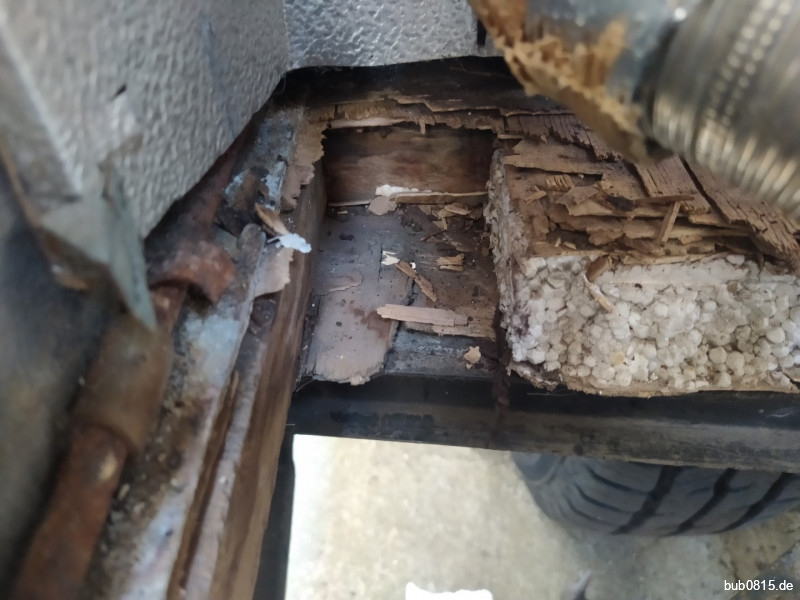 Man kann sehen, dass bereits zahlreiche Ausbesserungen stattgefunden haben. Die gesamte Bodenplatte war nachträglich von unten mit ca. 1 cm geschlossenzelligem Schaumstoff beklebt. So konnte eingedrungende Feuchtigkeit in Ruhe die Holzbestandteile zersetzen.