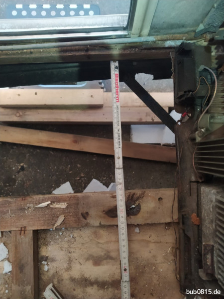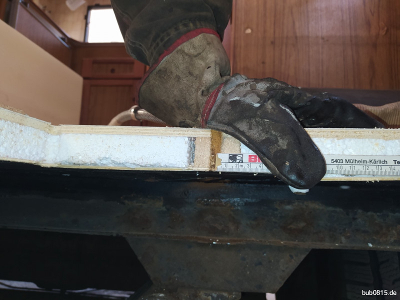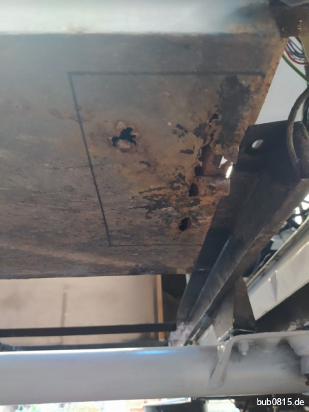 Die einzige Möglichkeit zur vollständigen Erneuerung der Bodenplatte ist es Stückweise vor zu gehen, um dem Aufbau noch ausreichend Stabilität durch den Rest der Bodenplatte zu lassen. In meinem Fall vorne beginnend. Also greift man beherzt zu Stichsäge und Oszillierer und entfernt ALLES. Hilfreich ist es dabei von unten löcher vor zu bohren, die man dann als Eckpunkte für die Stichsäge verwenden kann. So lässt sich das Risiko in Metallteile zu sägen minimieren.