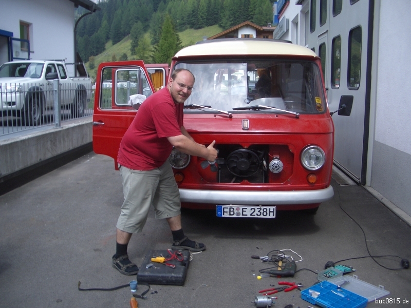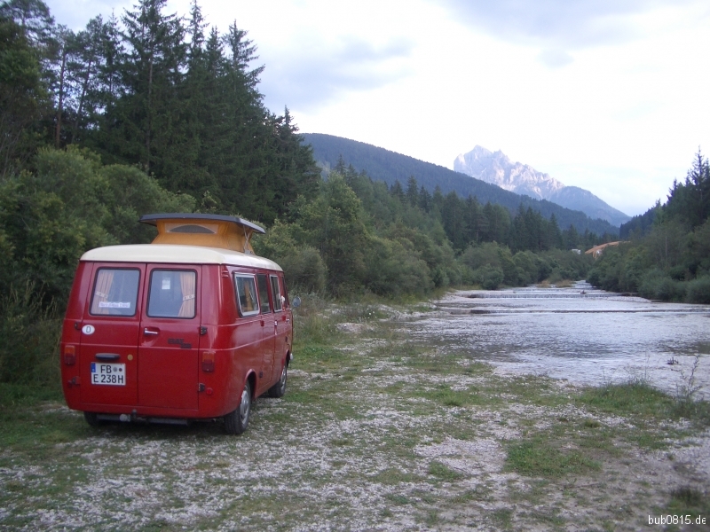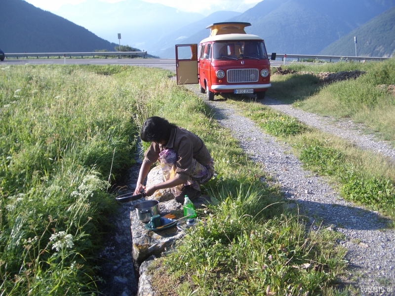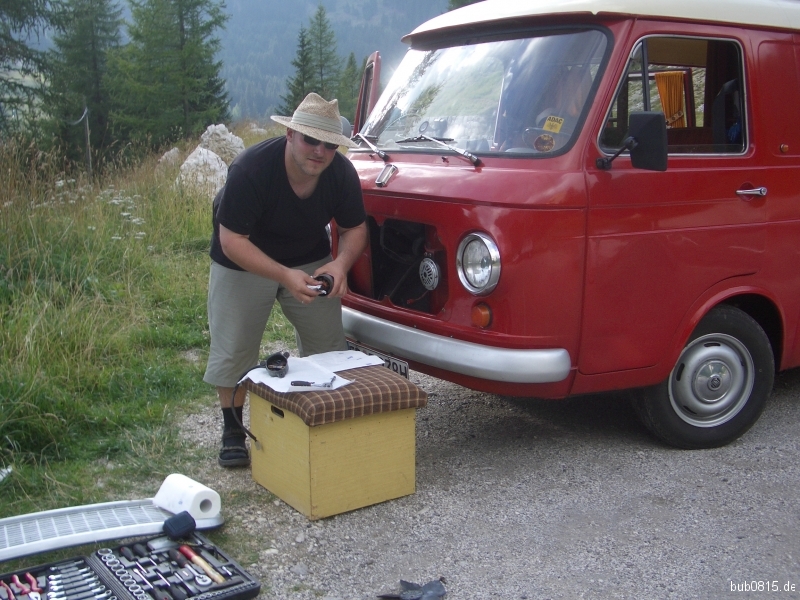 Ein schöner, wenn auch kurzer Urlaub führte uns im August 2009 in die Dolomiten. Dabei bewies unser Pablo, dass auch lange Strecken am Stück kein Problem darstellen. Die erste Nacht verbrachten wir bereits auf Italienischem Boden (am Reschensee). Dann ging es für eine Woche kreuz und quer durch die Dolomiten. Einige Wanderungen und Sideseeing stand auf dem Programm. Bergseen lockten mit Kristallklarem (wenn auch kaltem) Wasser und kulinarisch hat die Region ja auch einiges zu bieten. Kurz vor dem Sellajoch versagte dann der Kühlermotor seinen Dienst. Glücklicherweise hat uns eine super nette Werkstatt in Wolkenstein (Selva di val Gardena) ihr Werkzeug nutzen lassen und hatten auch noch irgeneinen Lüfter im Schrott (Golf 3 oder so), den wir einfach vor den Kühler geschraubt haben. Wie immer – das Ersatzteil lag natürlich überholt und einsatzbereit daheim im Regal… Danach verlief alles Weitere wie geplant und wir konnten uns sogar noch etwas entspannen.